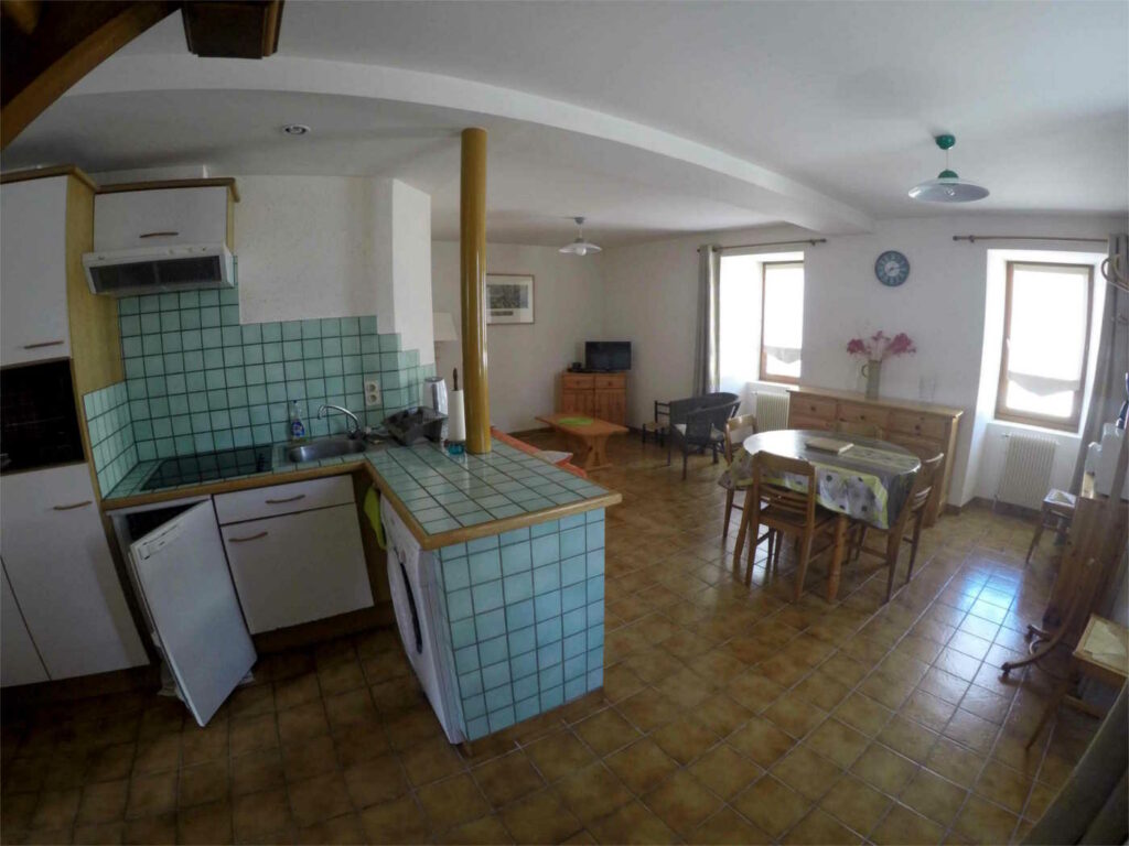 Au rez-de-chaussé vous avez accès à la salle commune avec une cuisine équipée, une grande table, un coin cheminée et une salle d’eau (2 WC, 2 douches, 3 lavabos)